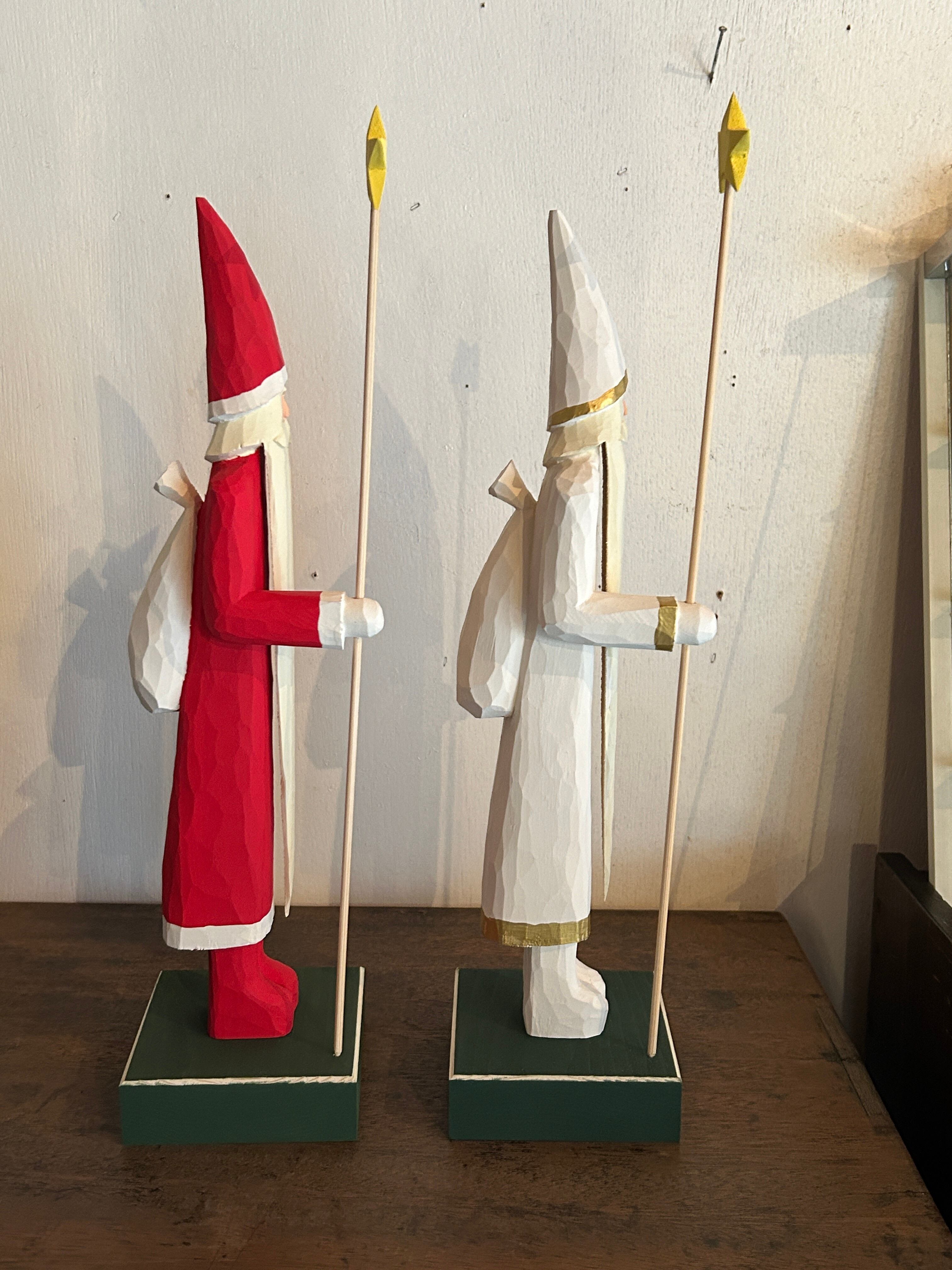 立サンタの赤と白は緑の土台にくっついて立っています。